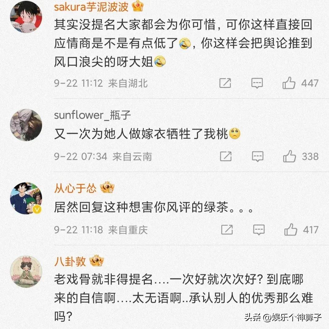 一些網友覺得,這姐糊塗啊,明知道這條博文陰陽怪氣的還點贊,本身在《人世間》中的戲份就少,又不是主角,沒提名也正常,哪裏來的自信呀!這種做法太小家子氣,格局有點低了,宋佳在劇中表現的更好,也沒提名,看看人家多低調。