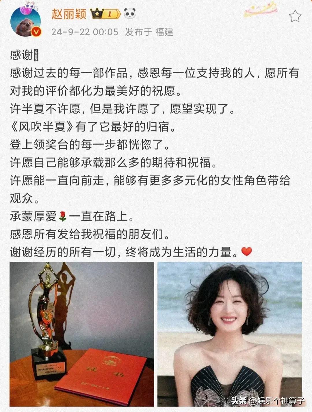 9月22日,趙麗穎凌晨發文,談及獲得飛天獎視後的感受,樸實無華的語言讓人感動,感恩所有支持自己的人,坦言會塑造更多的角色呈現給觀衆。