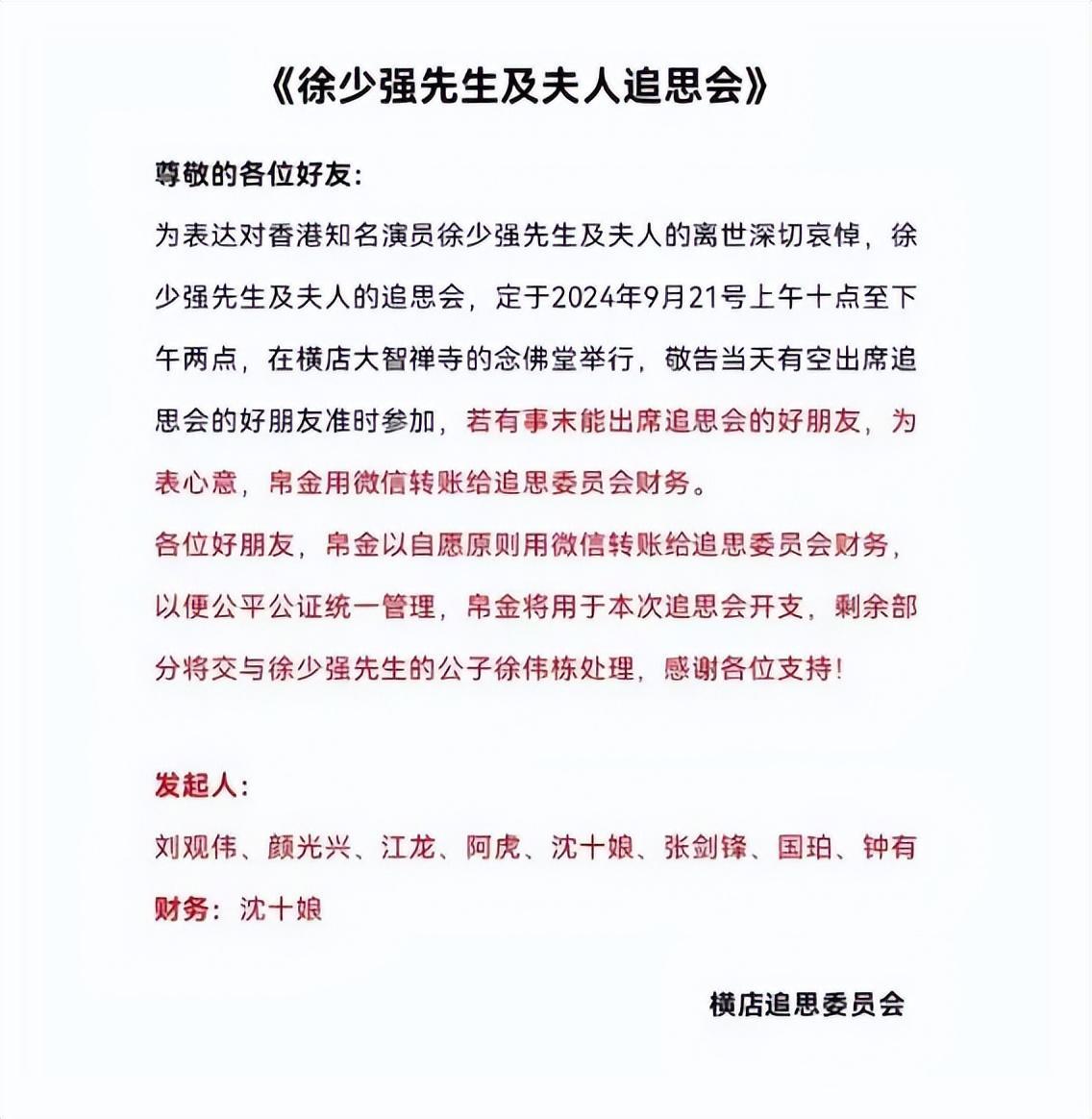 此次追悼會,並非由徐少強的5名子女發起,而是由執導了《殭屍先生》《怪俠一枝梅》《三笑之才子佳人》等電影的導演劉觀偉和其他7人發起。