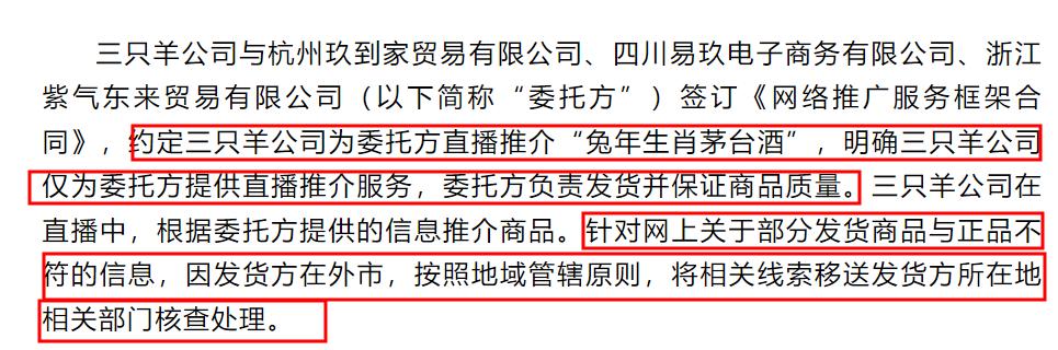 信息四:有三家公司委託三隻羊直播推介“兔年生肖茅臺酒”,三隻羊根據對方提供的信息推介商品,對方負責發貨和保證商品質量。針對網上關於部分發貨商品與正品不符的信息,因發貨方在外市,按照地域管轄原則,合肥方面已經將相關線索移送發貨方所在地相關部門覈查處理。