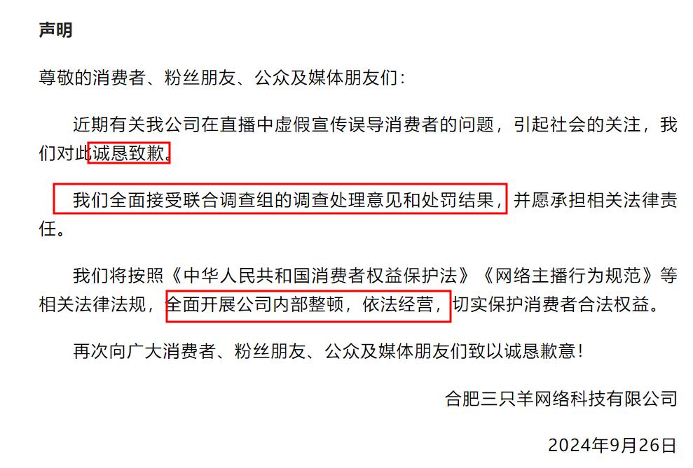 三隻羊誠懇道歉,接受處罰,並將全面開展公司內部整頓,依法經營。