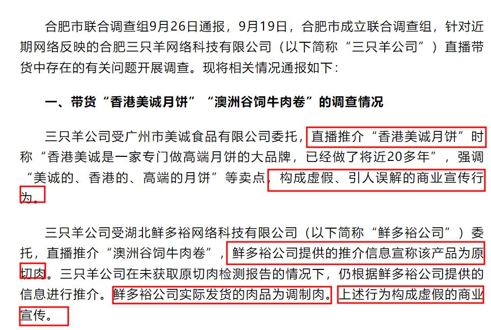 對於此問題,9月17日,合肥市高新區市場監督管理局發佈情況通報。表示對三隻羊在直播帶貨香港美誠月餅過程中涉嫌“誤導消費者”等行爲已經立案調查,將根據調查結果依法依規處理。