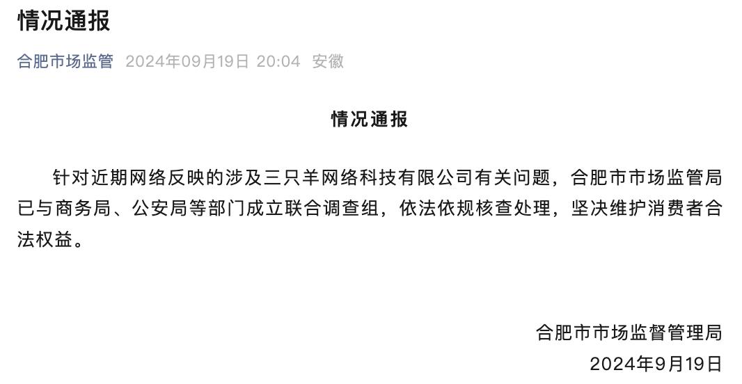 於是9月19日,合肥市市場監督管理局發佈了一份情況通報,表示對網絡反映的三隻羊有關問題,合肥市市場監督管理局已與商務局、公安局等部門組成聯合調查組進行調查處理。