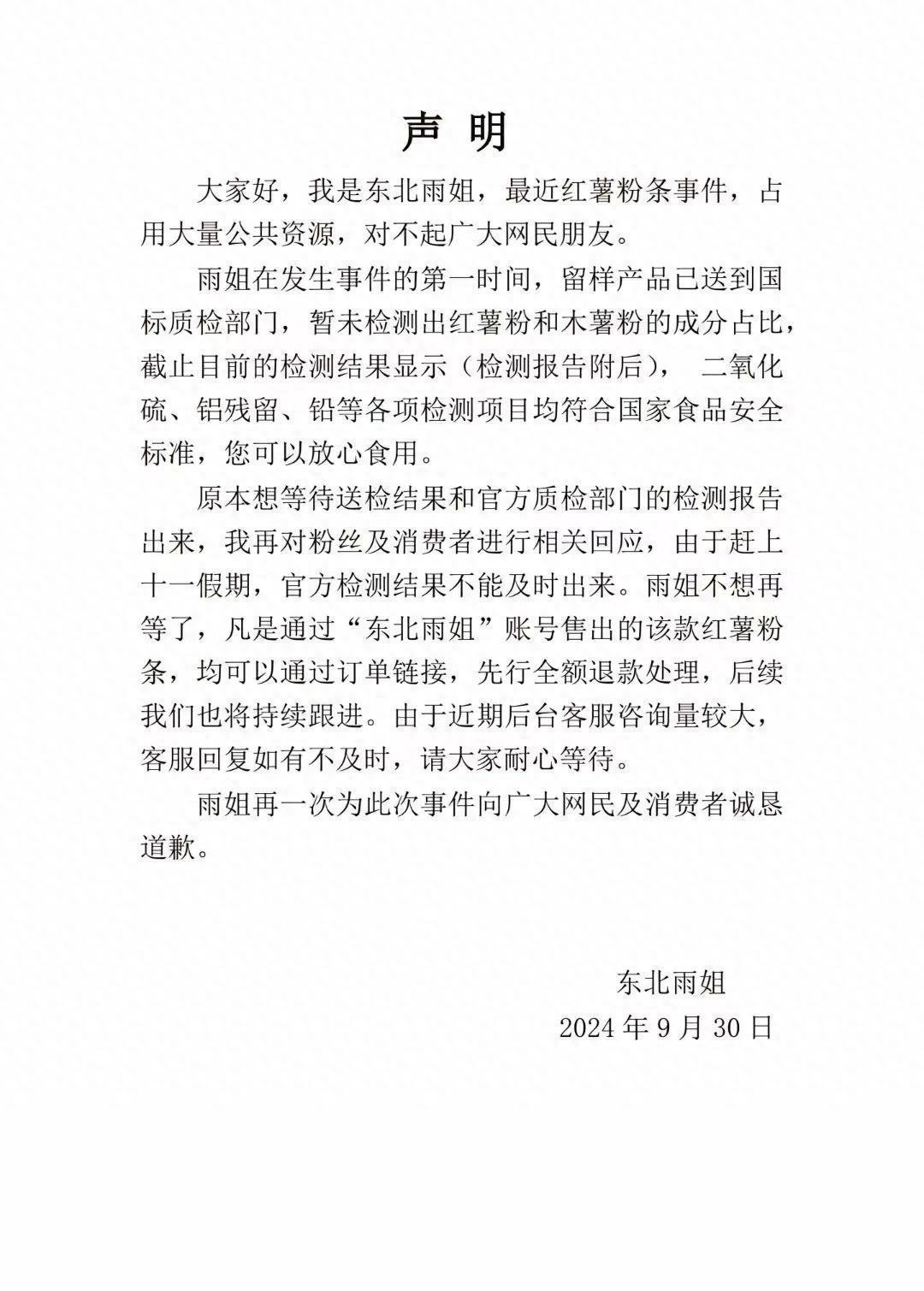第三點:雖然檢測結果沒出來,但東北雨姐不想等了,只要在東北雨姐賬號買了紅薯粉條的消費者,現在都可以全額退款處理,後續也將會持續跟進。