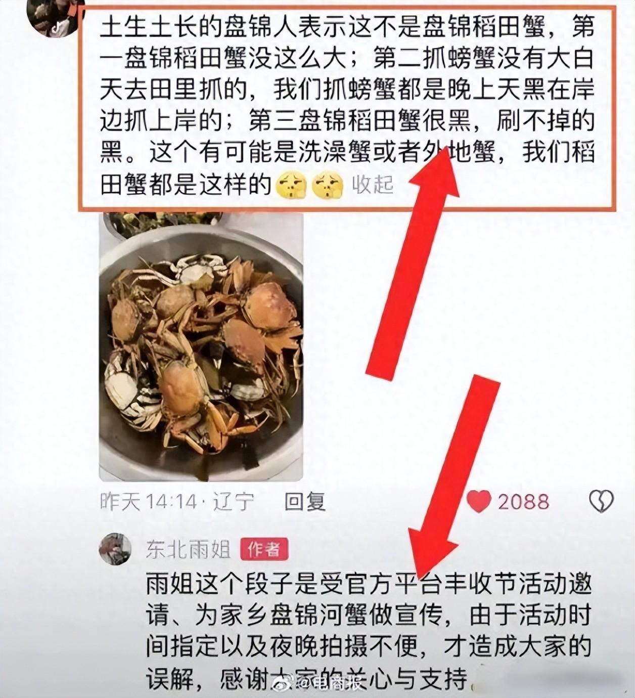 面對輿論熱議,東北雨姐再次回應了,她說她拍攝這期視頻是配合當地做宣傳,不是爲了賣螃蟹,她說由於活動時間指定以及夜晚拍攝不便,才造成大家的誤解。