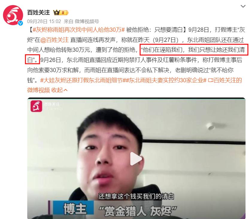 東北雨姐稱灰燼團隊是帶着目的上門偷拍錄像,故意激怒他們。她承認她的團隊有爆粗口和打人的情況,她知道這很不對,她向大家道歉。
