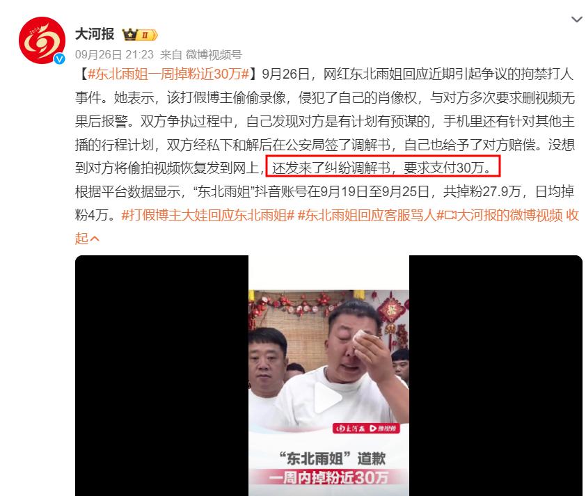 9月26日,在沉默3天之後,東北雨姐終於回應了。