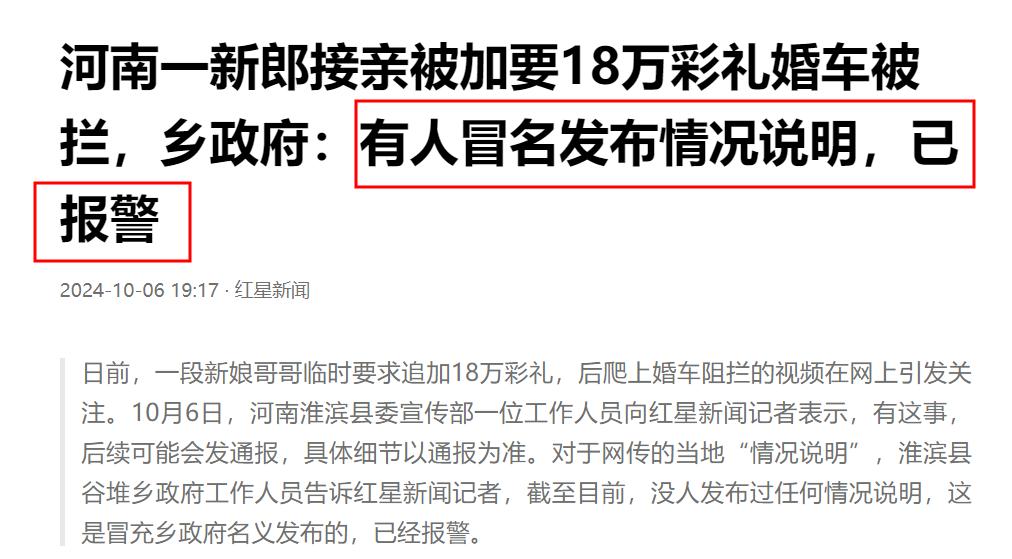而就在網友熱議的過程中,網絡流傳一份河南信陽淮濱縣谷堆鄉ZF發佈的《關於“新娘哥嫂臨時加彩禮18萬”輿情情況說明》。