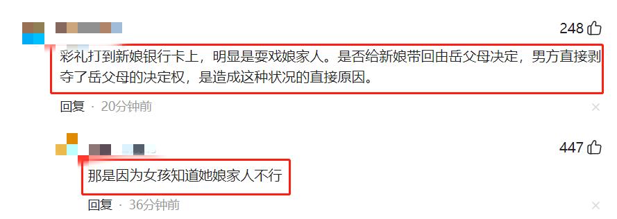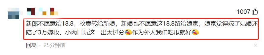 有網友認爲新郎不厚道,戲耍了新娘的孃家人,認爲新郎剝奪了新娘父母對禮金歸屬的決定權。