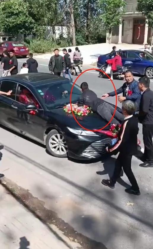 他們的車子還沒開動,新娘的哥哥就趕到了,他直接趴在了婚車上面,讓婚車無法開動。