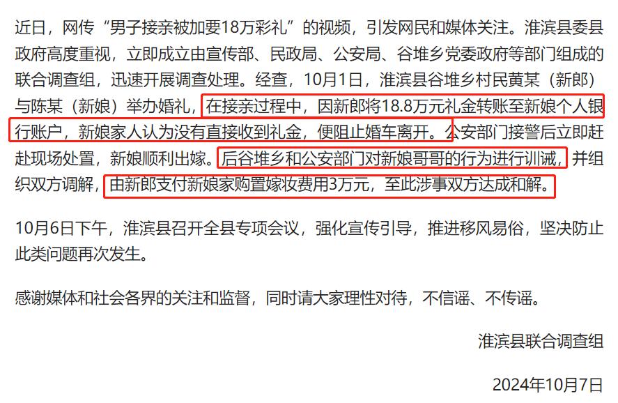 真相大白!官方通報男子接親被加要18萬彩禮,網友:3萬元買斷親情