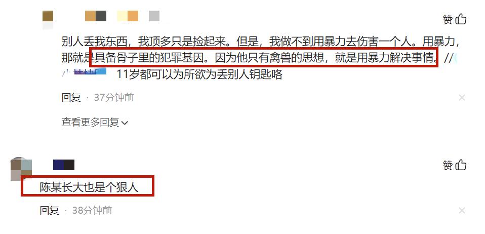 有網友認爲陳某骨子裏是一個狠人,從小就會用暴力手段解決問題,擔心他長大之後走上歪路。