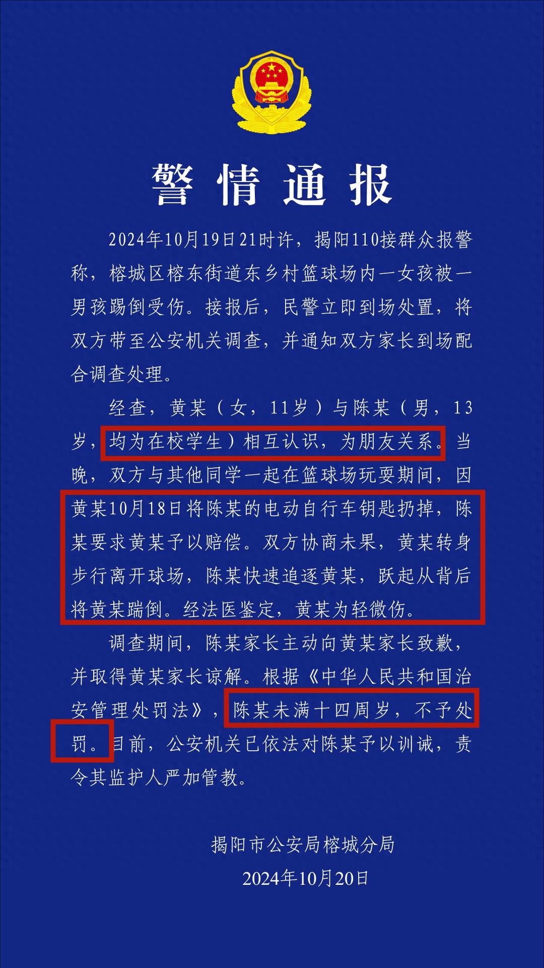4. 處理結果曝光。因陳某未滿14歲,根據《治安管理處罰法》,不予處罰。目前公安機關已經對陳某進行訓誡,責令監護人嚴加管教。陳某家長也向黃某家長道歉了,並獲得了諒解。