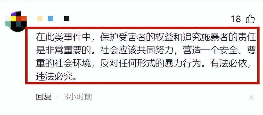 有網友則語重心長地說“在此類事件中,保護受害者的權益和追究施暴者的責任是非常重要的。社會應該共同努力,營造一個安全、尊重的社會環境,反對任何形式的暴力行爲。有法必依,違法必究。”