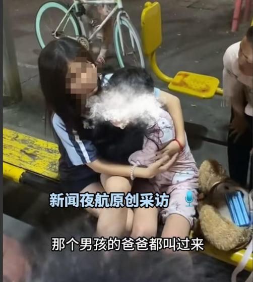 另一名女孩見狀,趕緊上前抱住粉紅衣女孩進行安慰。