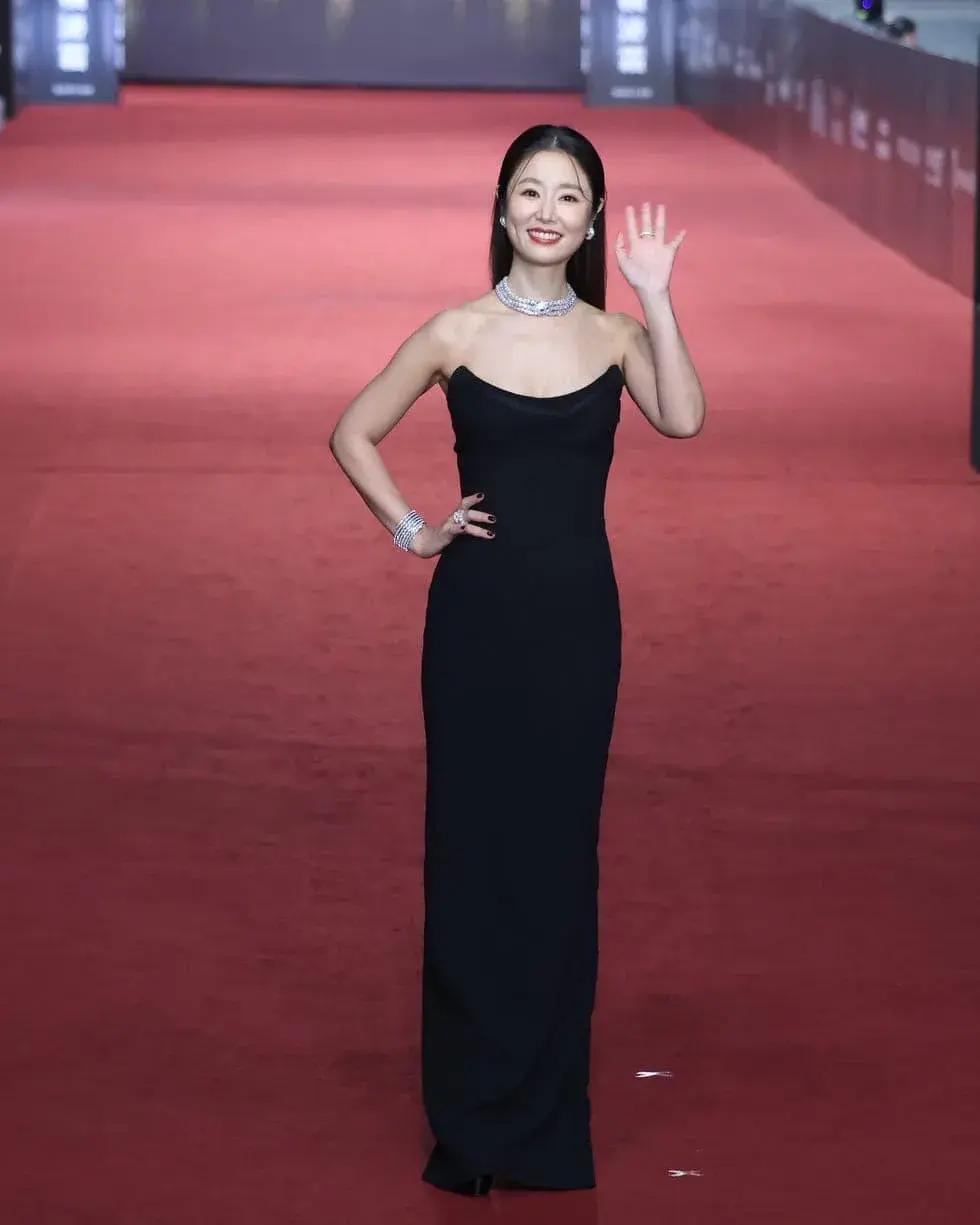 紅毯上的她,身穿Versace雕塑感黑裙,配合銀蛇項鍊,當年那張清純的娃娃臉,雖然有了歲月的痕跡,但卻充滿了人生贏家的自信和篤定。