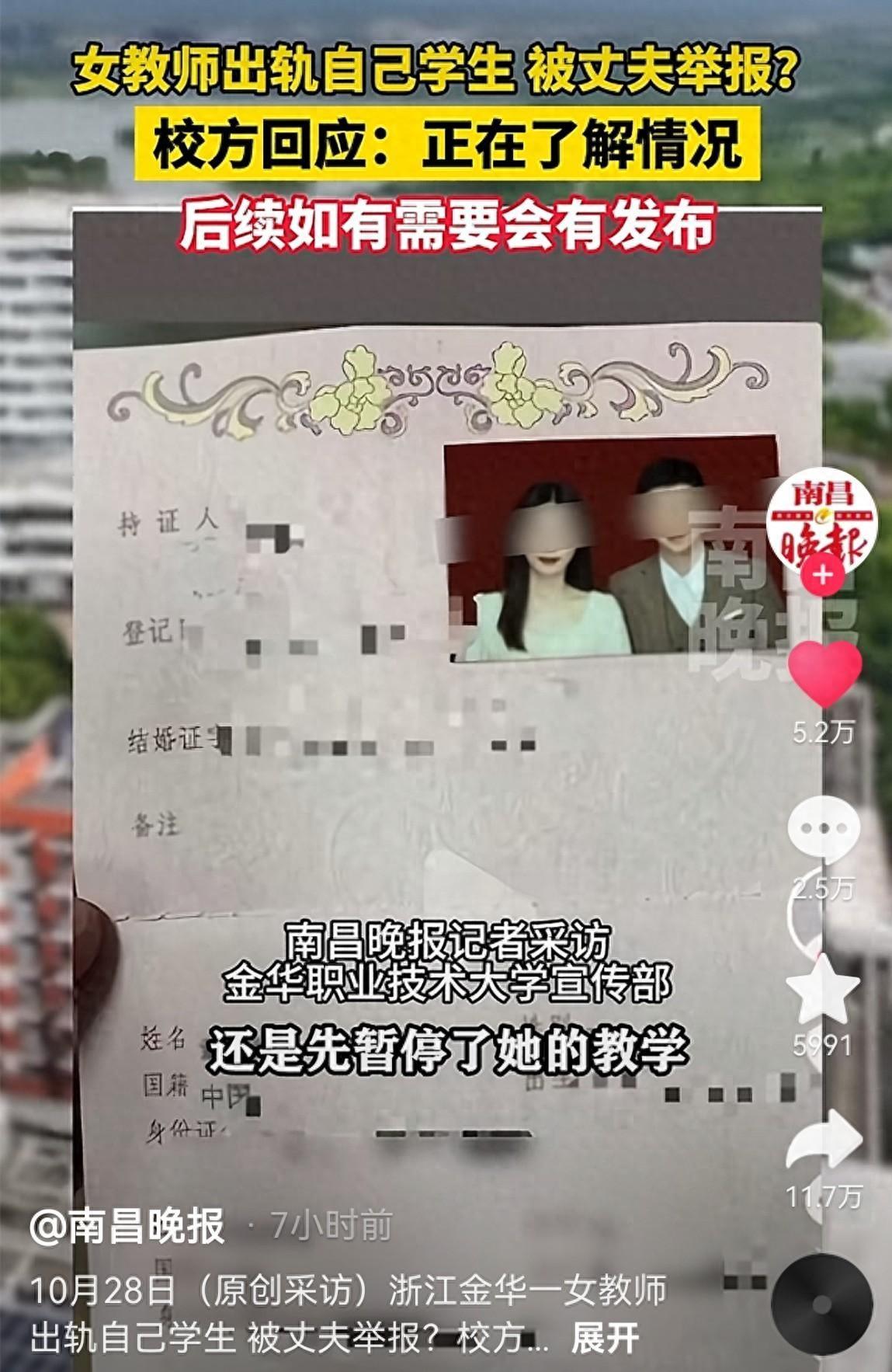 10月28日,浙江的一名女老師火了,不過不是因爲什麼好事,她被自己的丈夫曝光出軌了男學生。