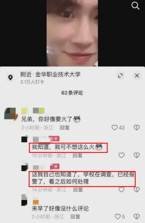 男學生還回應了此事,當有網友對他說他要火了時,他說“我知道,我可不想這麼火。”他還說學校在調查,已經報警了,看之後如何處理。