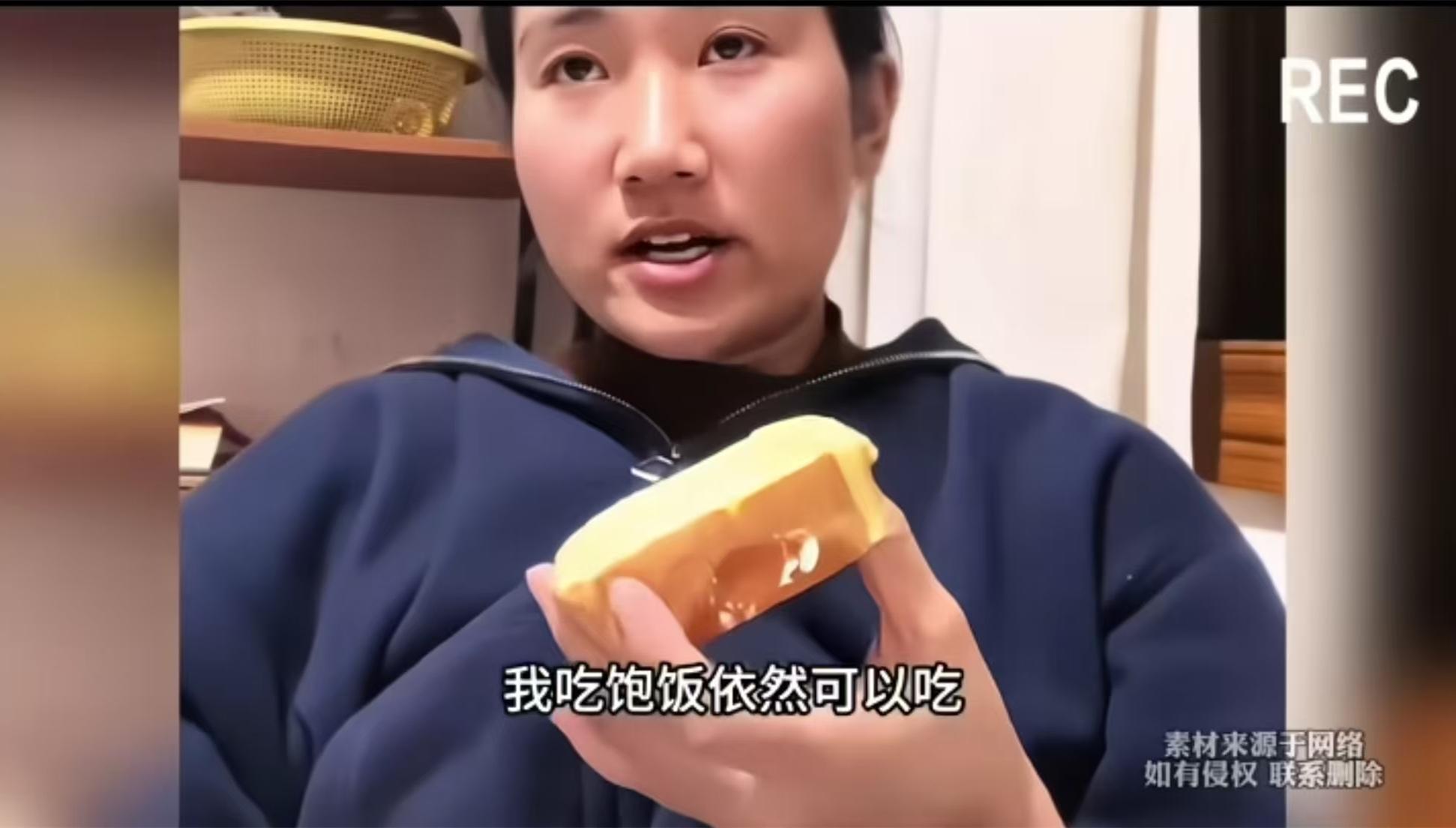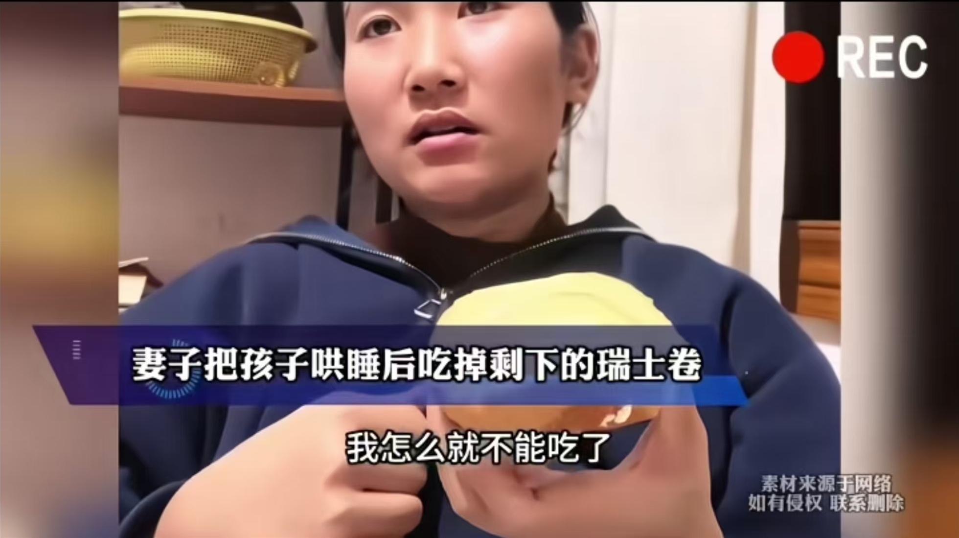 從女博主發佈的視頻可知,她原本想在2個孩子睡着後喫2個瑞士捲,但她剛將瑞士捲拿到手上,她老公就不讓她喫。