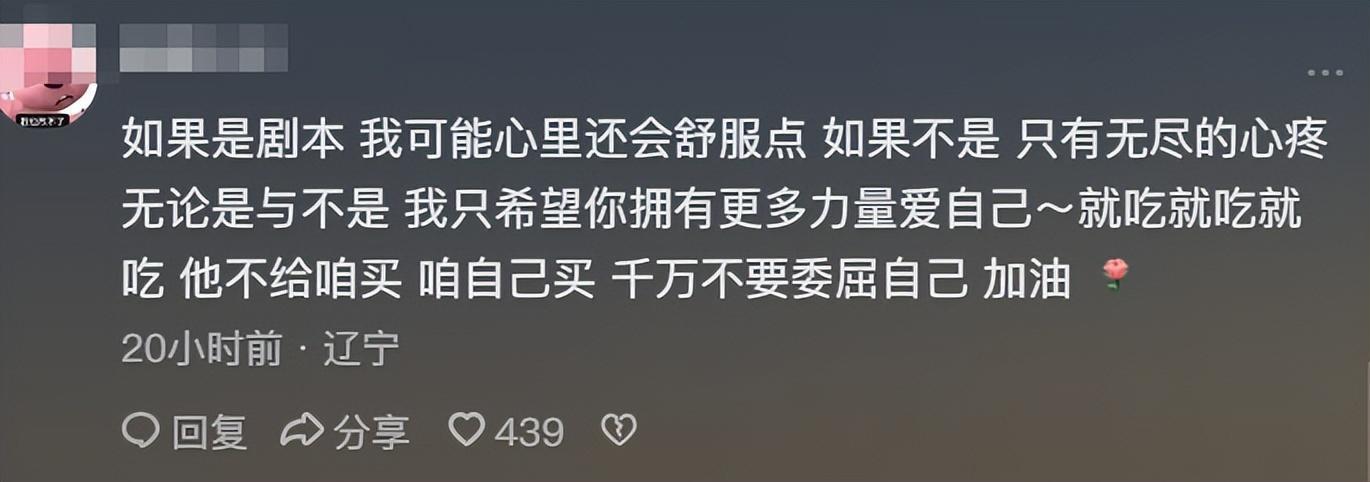 面對丈夫的一番說辭,女博主直言,她喫過飯了也能喫零食,她說她對孩子已經付出夠多了,她還說“你讓我做全職媽媽,你連這點蛋糕都供不起了嗎?”