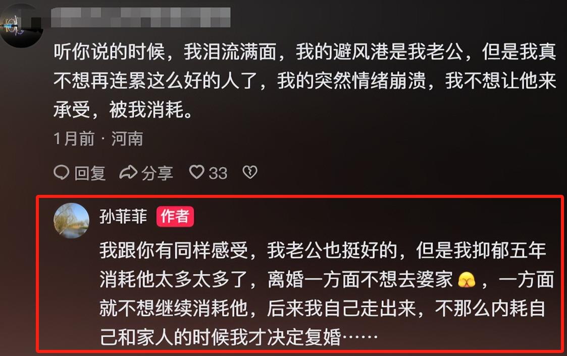 信息二:女博主承認她丈夫是一個很好的人,她說因爲抑鬱症,她消耗了丈夫太多。她還說曾因爲抑鬱症,兩人離婚,後來又復婚了。