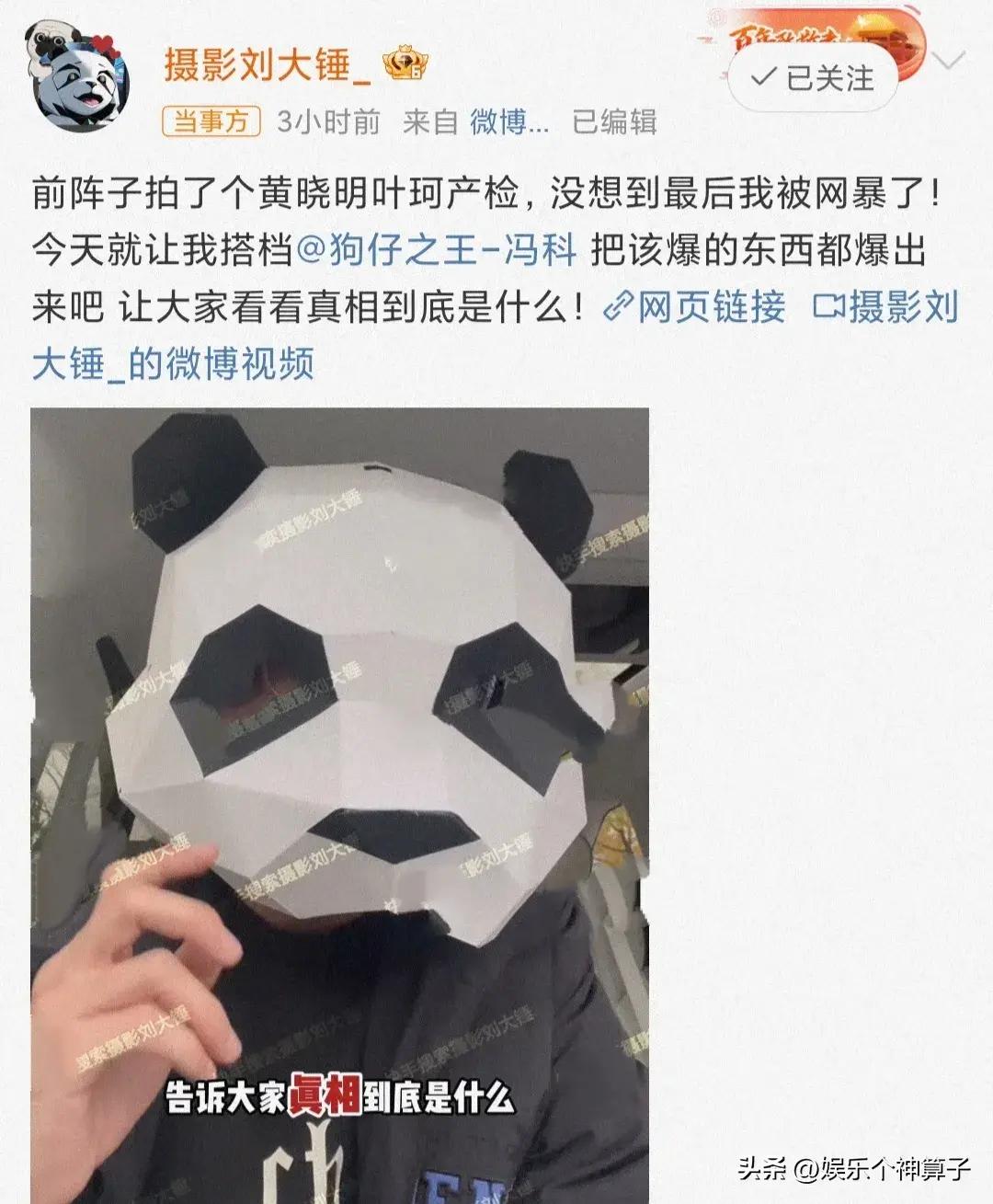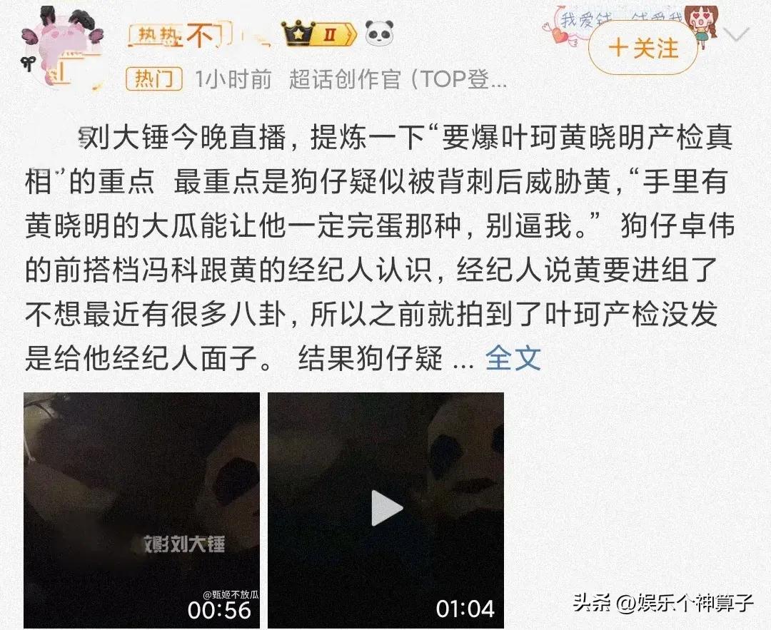 11月11日晚,劉大錘在社交平臺發文,並曬出一段視頻,透露因爲拍到黃曉明葉珂去醫院做產檢,結果遭到網 暴,感覺心裏非常的委屈,一氣之下,於是打算聯合另一位狗仔繼續爆料。