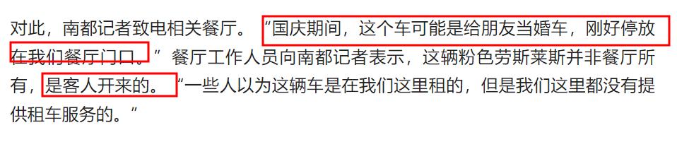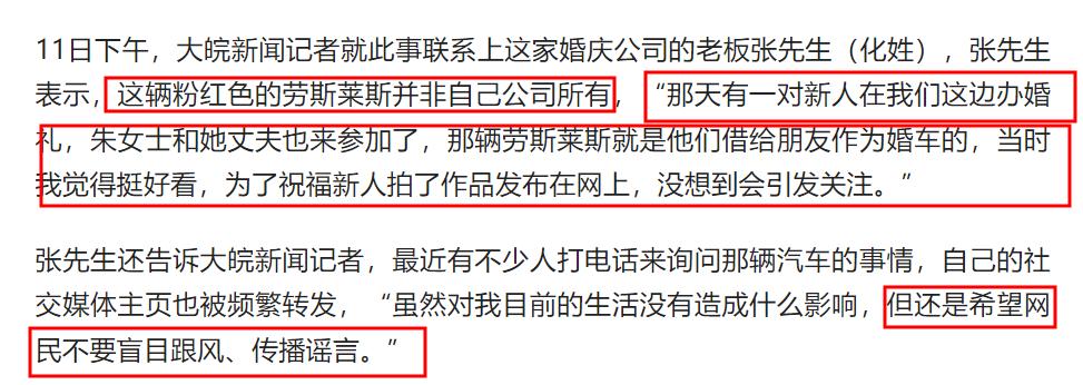 在朱根菜和貨車司機大兒子回應一天後,有媒體聯繫上了在賬號上展示過朱根菜的勞斯萊斯的婚慶公司,詢問這輛車是不是從他們公司租的。