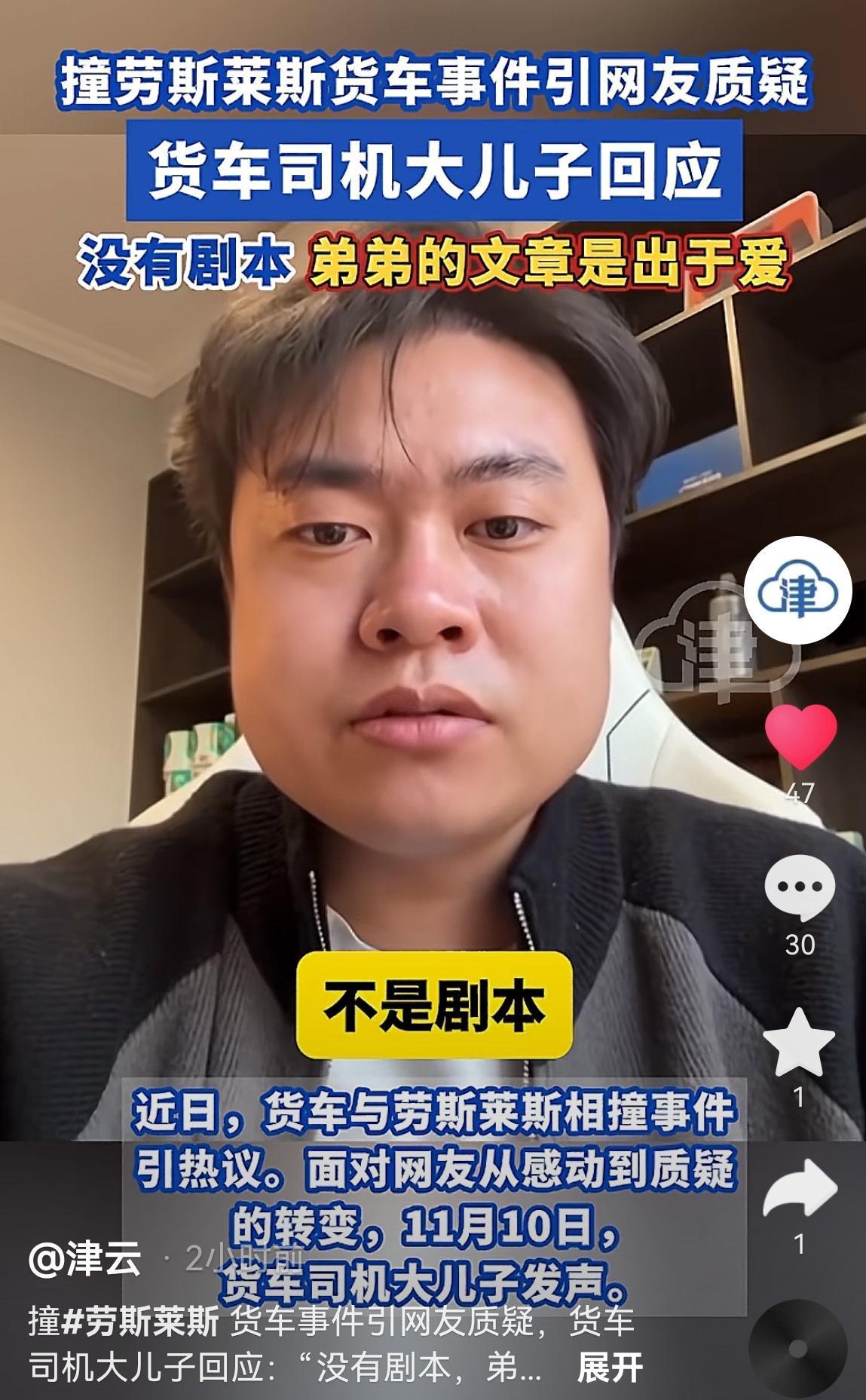 然而隨着貨車司機也開了直播,很多網友開始質疑這起勞斯萊斯被撞壞事件是劇本。