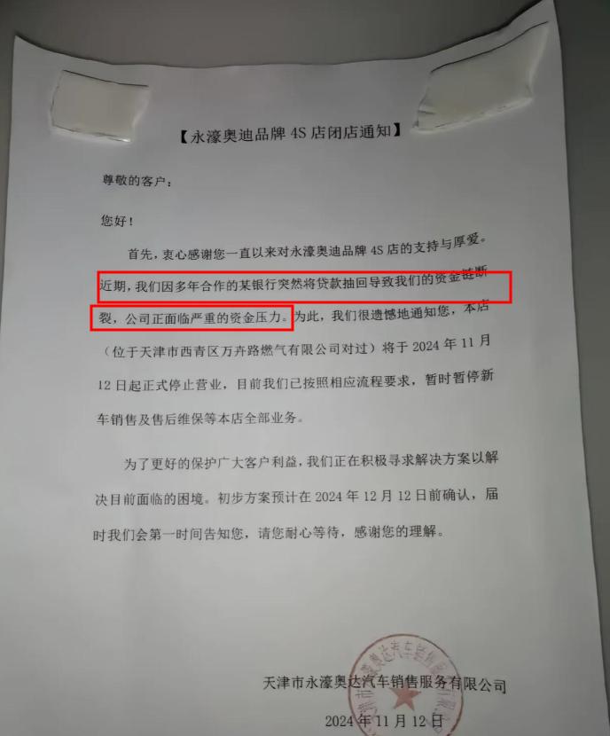 有一位奧迪車主曬出了關於該店發佈的一份閉店通知。