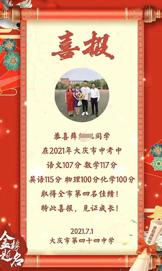 2021年中考,他取得大慶市第四名的好成績,彼時他語文考了107分,數學考了117分,英語考了115分,物理和化學都考了100分。