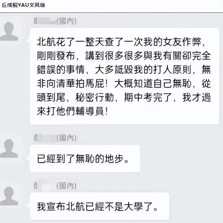 而在另一張網傳截圖中,該男生則說北航傳出來的一些與他有關的消息是錯誤的,還說他被詆譭了,隨後他便說出了那句震驚高校圈的“我宣佈北航已經不是大學了。”