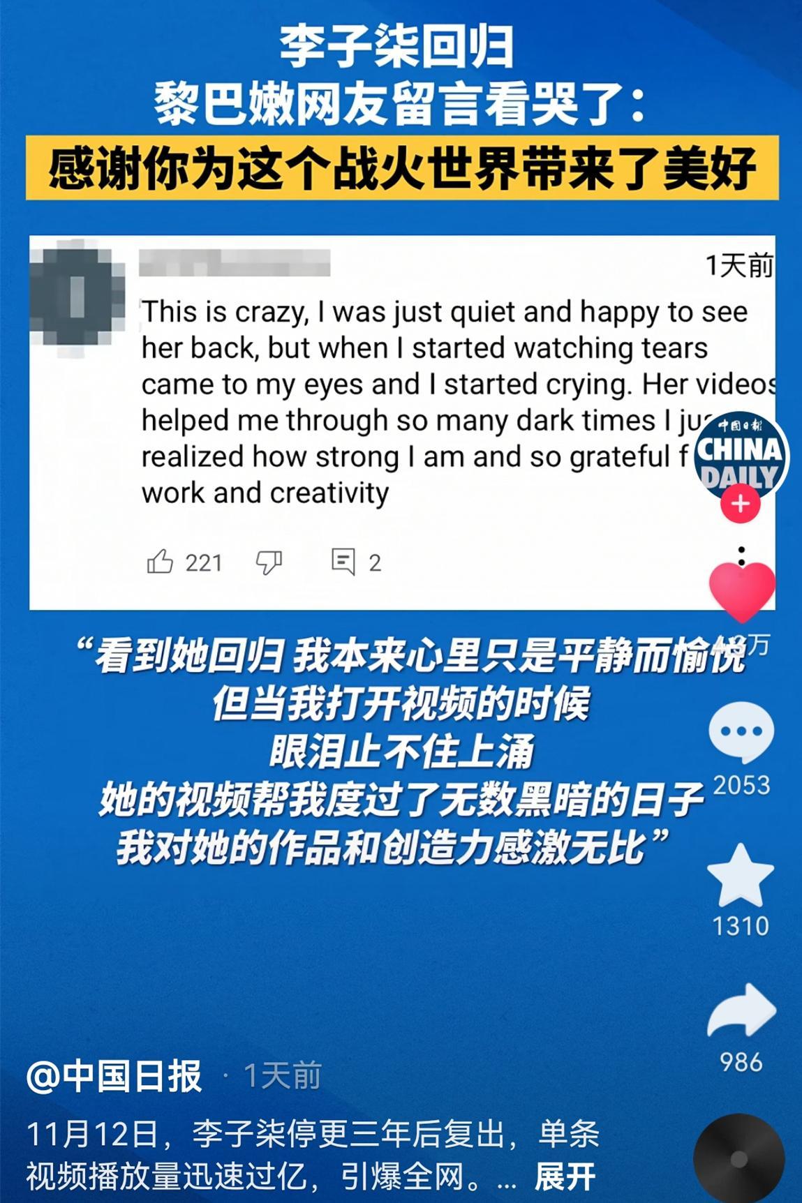 除了令人羨慕的數據外,李子柒的迴歸令國內外網友都沸騰了。
