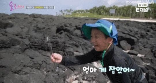 趕海的時候,他全身心投入,蔡琳不敢碰螃蟹,他就接下重擔,自己拿着鑷子趴在石頭縫裏找。