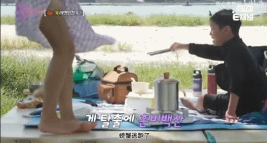 玩累了,蔡琳用珉宇抓到的螃蟹煮泡麪,當螃蟹意外從盒子裏爬出去之後,把蔡琳嚇得立馬站起來尖叫。