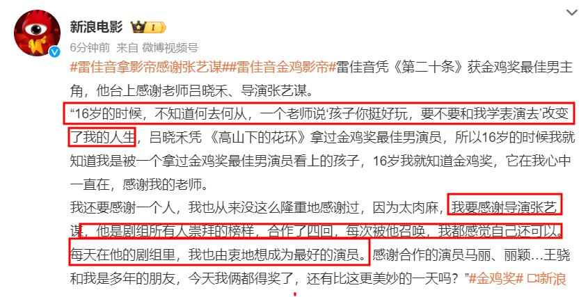 如今在電影界斬獲大獎,雷佳音非常高興,在發表獲獎感言時,他感謝了呂曉禾和張藝謀。