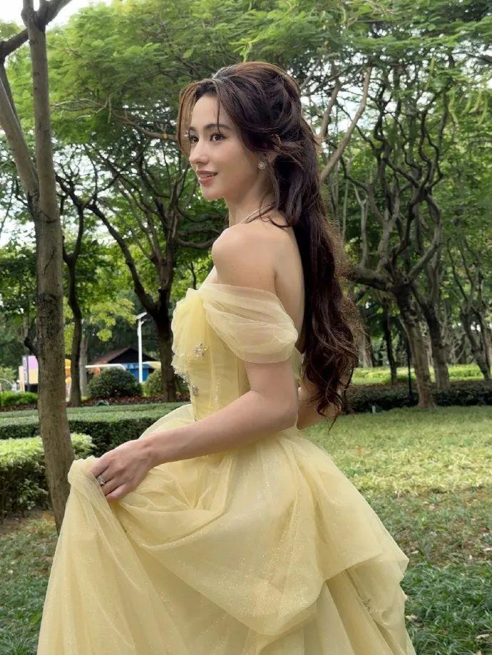03年生的李宛妲,走的是迪士尼公主路線,高顱頂的微卷半扎發和鵝黃色的收腰紗裙,完全是貝兒本人。