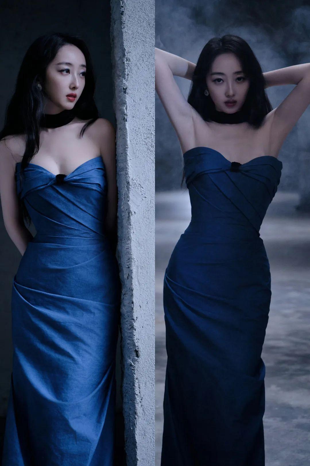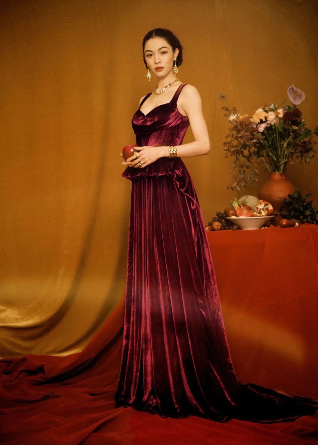 她的身材向來優越,瘦而不柴,比例堪比超模,這次穿着低胸絲絨裙,寬肩窄腰,事業線尤爲吸睛。