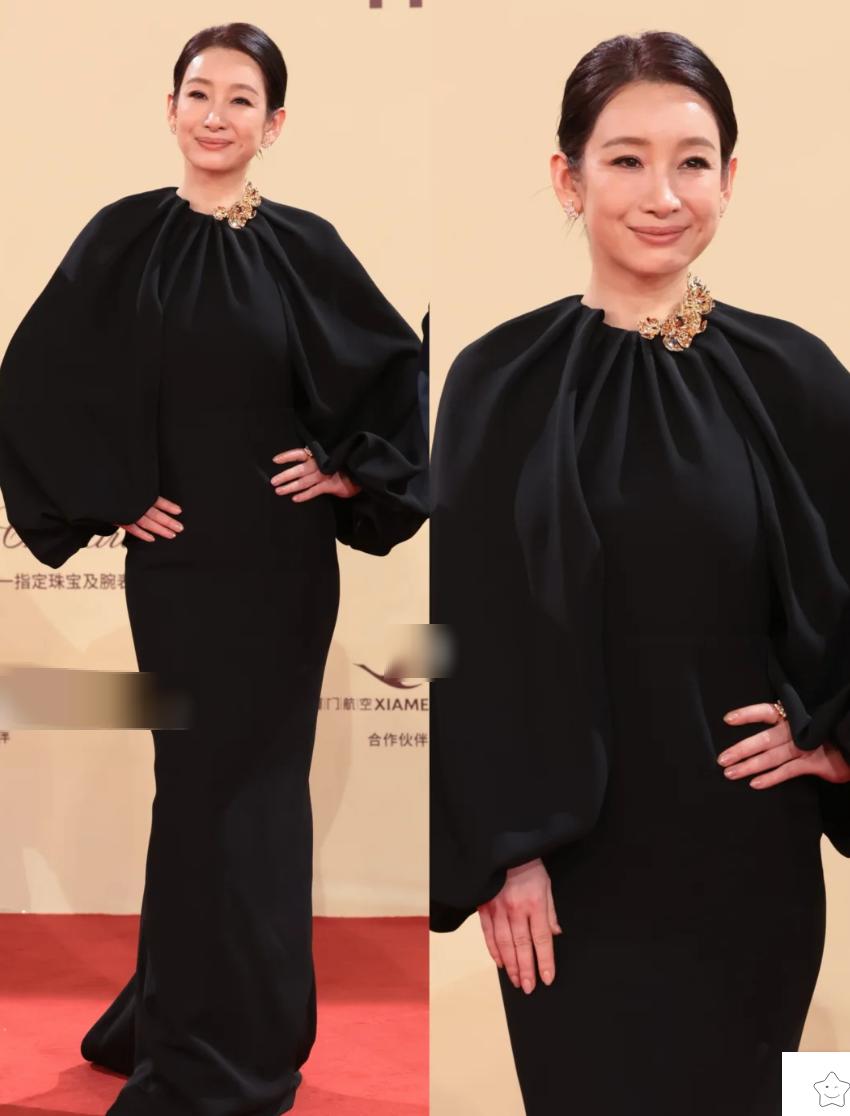 秦海璐這次的禮服,主打全身black色調,包裹得那叫一個嚴實,估計是金雞紅毯上穿最多的一個了。
