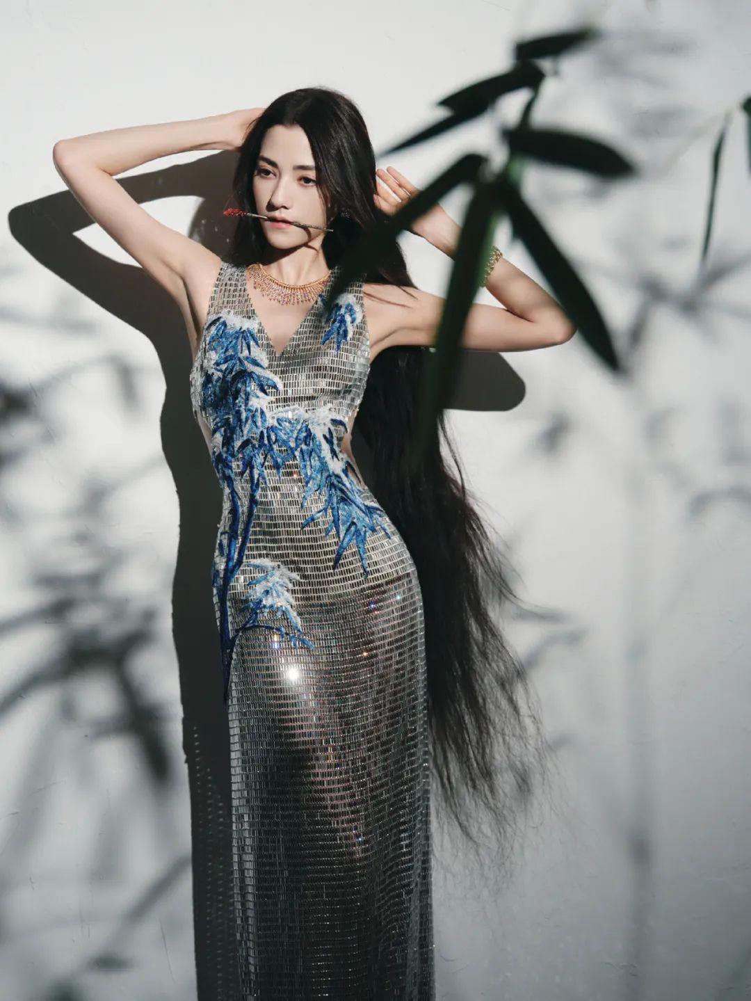 一襲銀色亮片長裙,細節十足,山林竹青、深V鏤空......各種服裝元素,尤其是藍竹的刺繡圖案,再次彰顯國風。