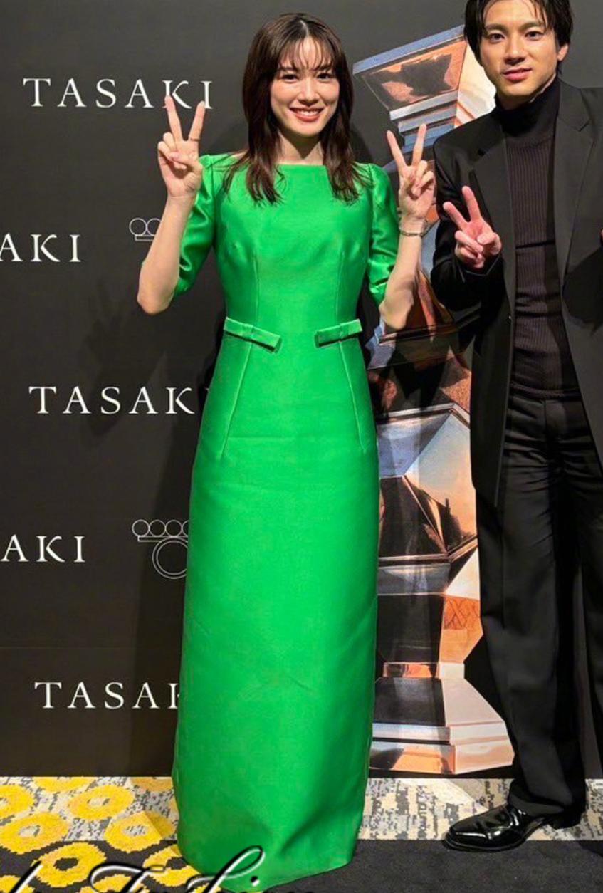 禮服來自prada定製,從頭到腳都是很豔麗的綠色,永野芽鬱也穿過同款。
