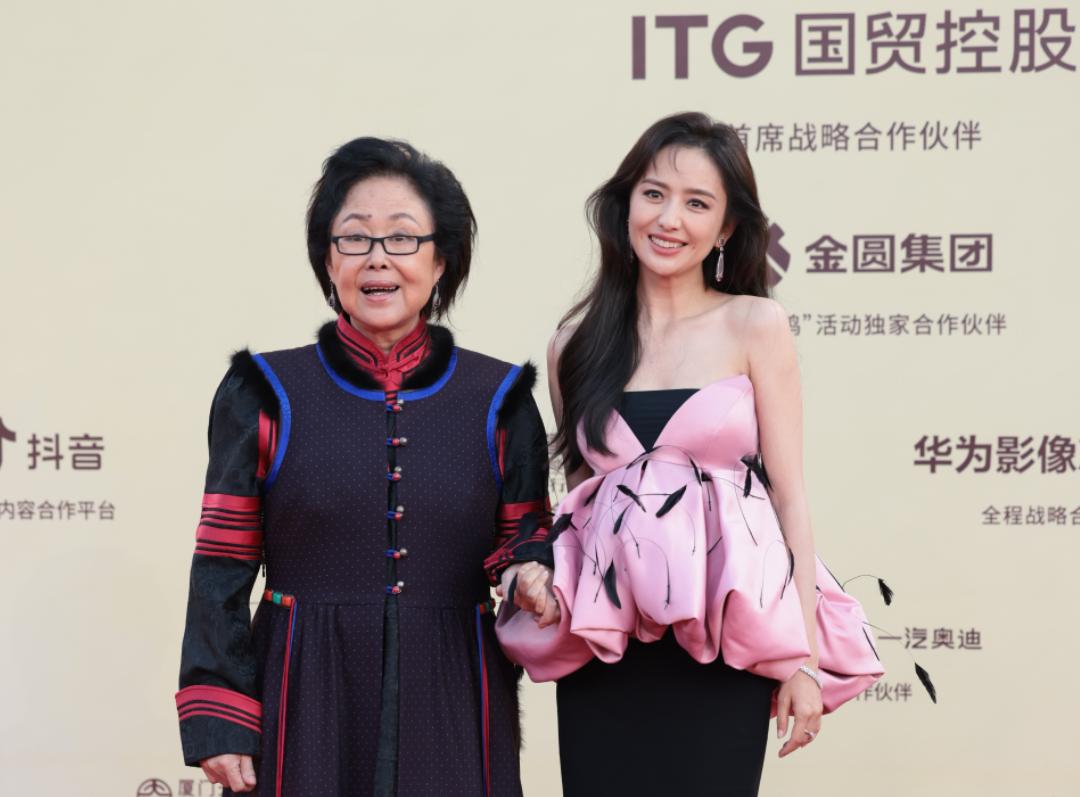 和斯琴高娃一起走紅毯的佟麗婭,穿了一件撞色大膽的粉黑羽毛裙。