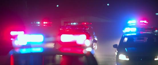 在燈火通明的都市夜景中,警車連續呼嘯而過,輪胎摩擦地面發出尖銳的聲響。
