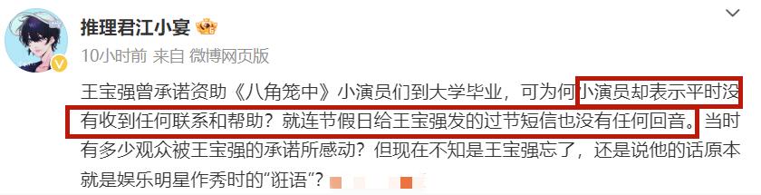 當時,江小宴稱王寶強曾承諾資助拍攝《八角籠中》的小演員上學,但沒有兌現承諾。