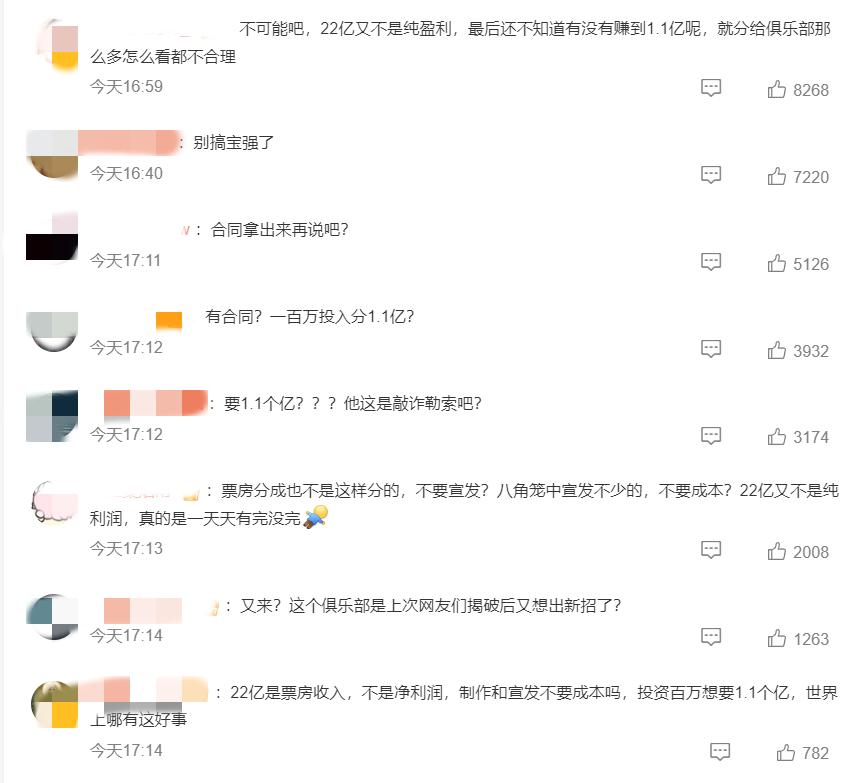 有網友說恩波俱樂部在“敲詐勒索”,直言票房22億,不是收益22億,要拋去各種成本和分成,才能算出利潤。