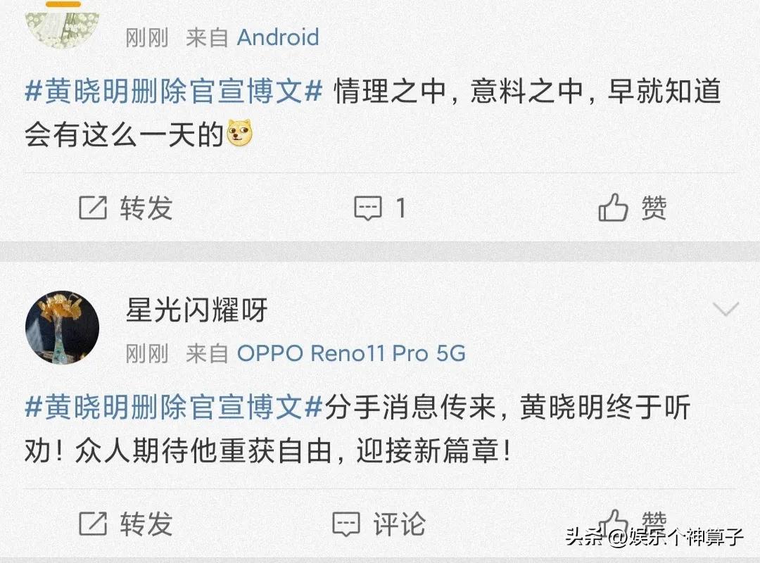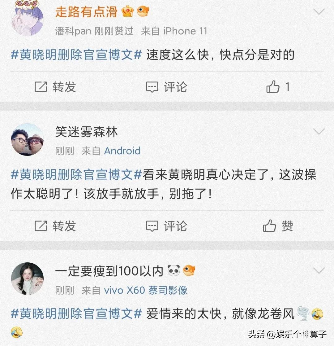 網友們看到黃曉明刪除官宣文案的消息,紛紛拍手叫好,認爲如果分手了,纔是明智的選擇,該放手時就放手,不要一拖再拖,並調侃:愛情來的太快,就像龍捲風。