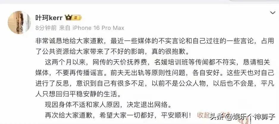 最後,以葉珂退網收場,並向大家道歉,同時澄清一些網上不實傳聞,準備安心在家保養身體,本以爲一切都安靜了,沒想到,黃曉明還是刪除博文。
