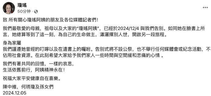 他們在文章中寫道“告別式將不設公祭,也不舉行任何媒體會或紀念活動,不佔用社會資源。在此刻希望大家給予我們家人一些時間與空間緩和悲痛的心情。”