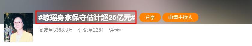 此外,在2019年丈夫平鑫濤病逝後,瓊瑤分得價值6億的房產,再加上夫妻合辦的影視公司,瓊瑤的身家保守估計超過25億元。
