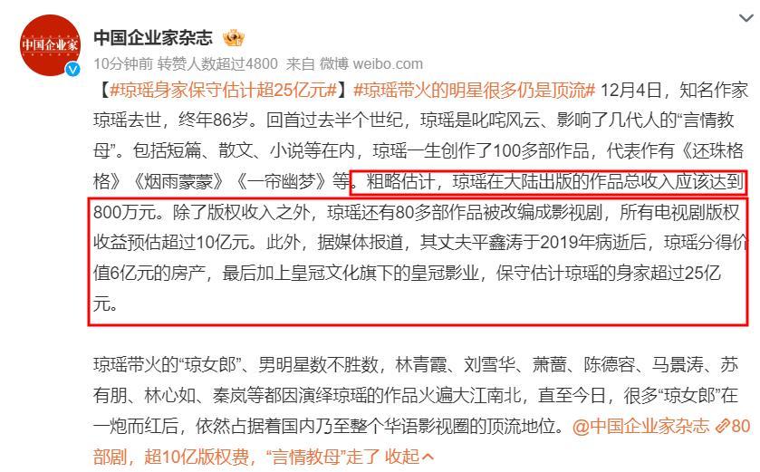 根據《中國企業家》雜誌的報道,瓊瑤在大陸出版的作品總收入在800萬左右。瓊瑤有80多部作品改編成了影視劇,所有電視劇版權收益預估超10億元。