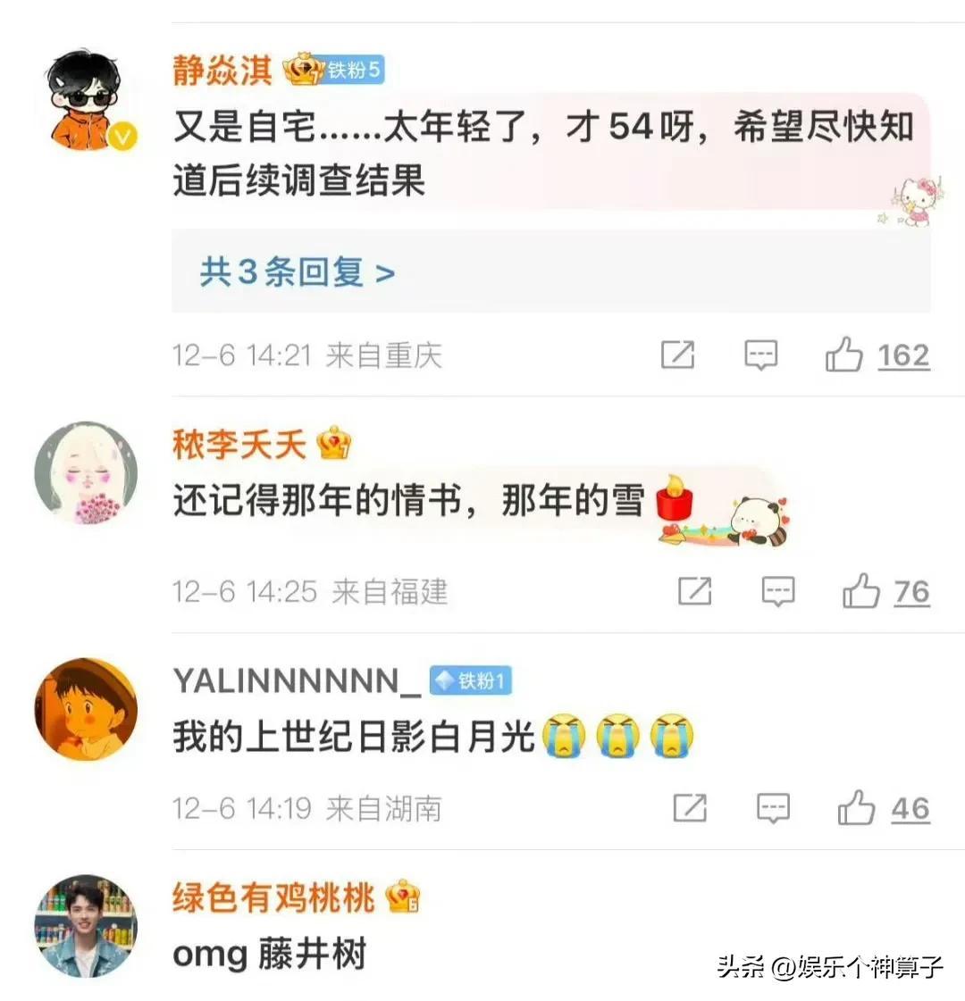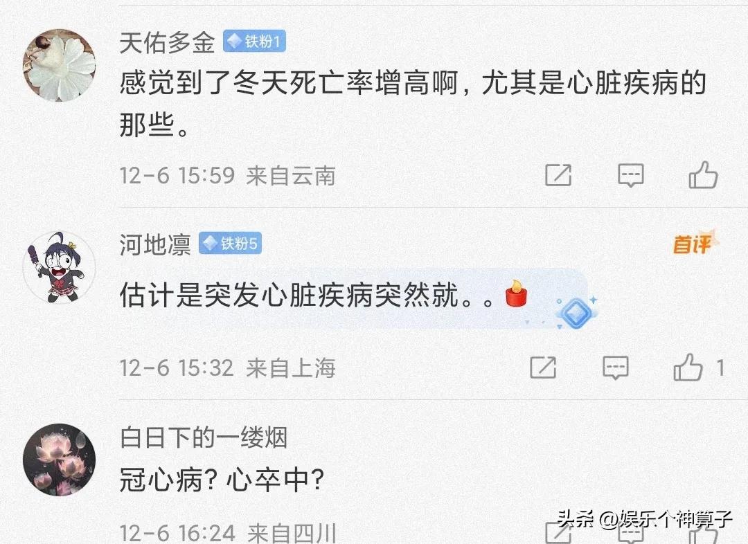 看到發文,一些網友猜測,可能因突發疾病去世,也有猜測由於內心煎熬,一個人過於孤單選擇輕生,至於到底什麼情況?只能等待調查結果。